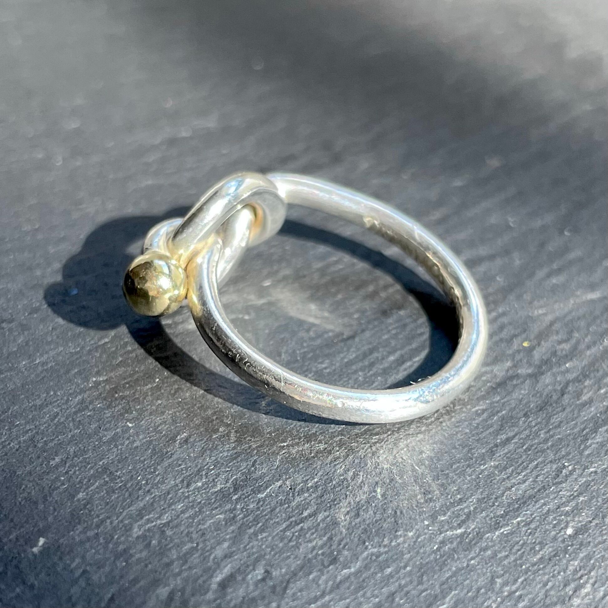 シンプルでありながらも18Kのゴールドのボールとシルバー925の素材を組み合わせたユニークなデザインのラブノットリング。