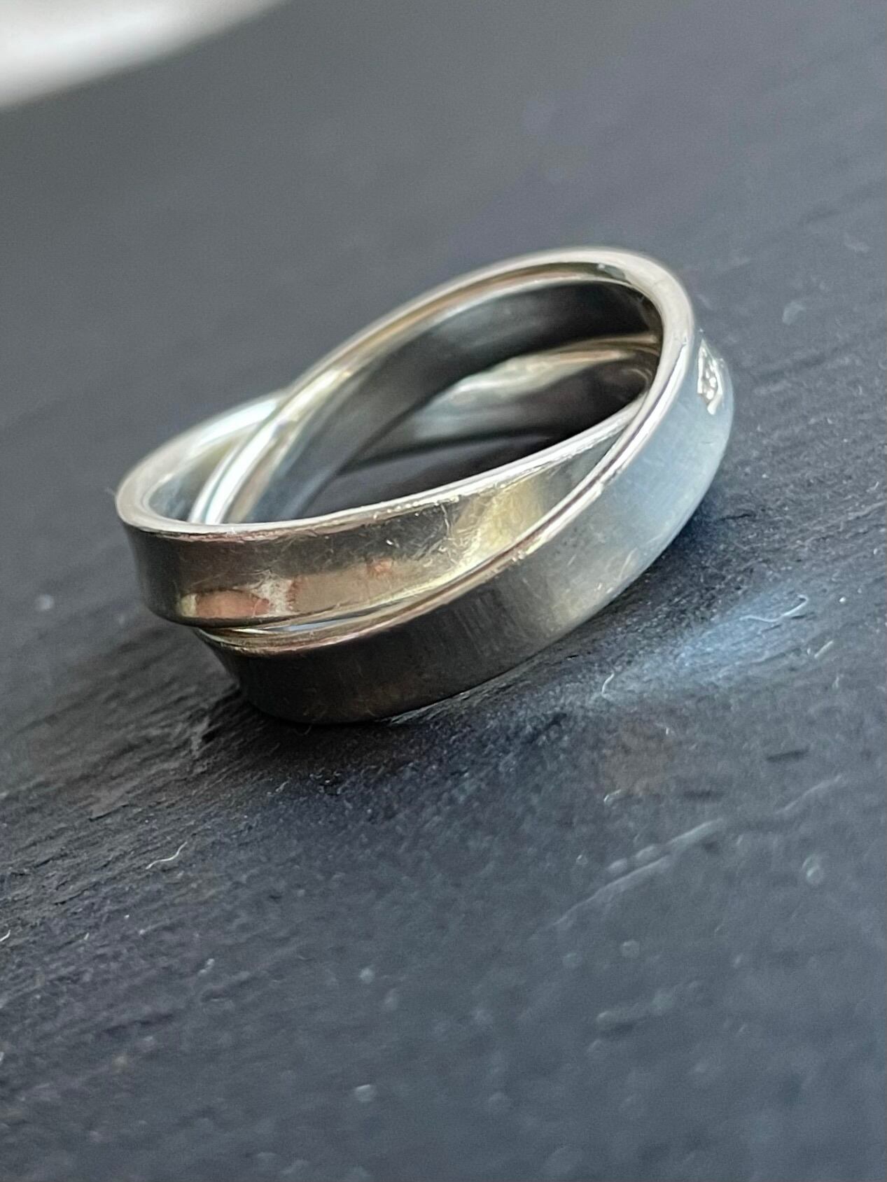 シンプルで上品なデザインが魅力のインターロッキングリング。2つのリングが組み合わさったデザインで、指先をエレガントに飾ります。