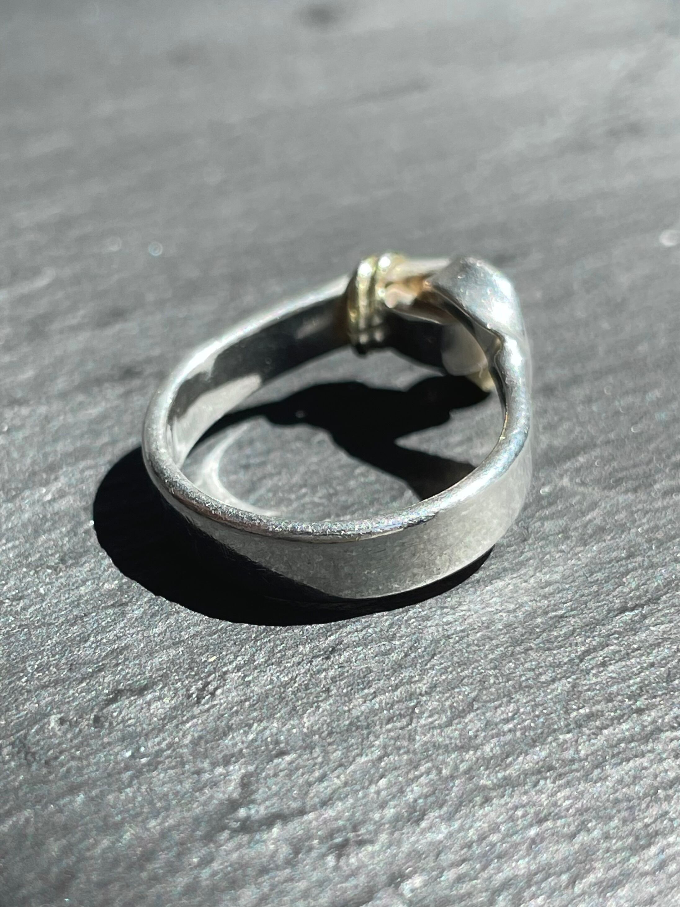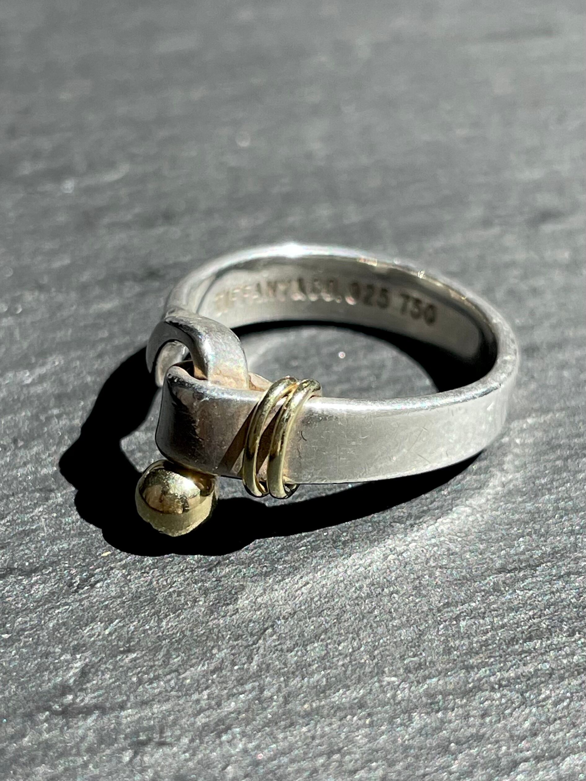 18Kゴールドとシルバー925の素材を合わせたユニークでエレガントなデザインが特徴のフック&アイ リング。